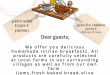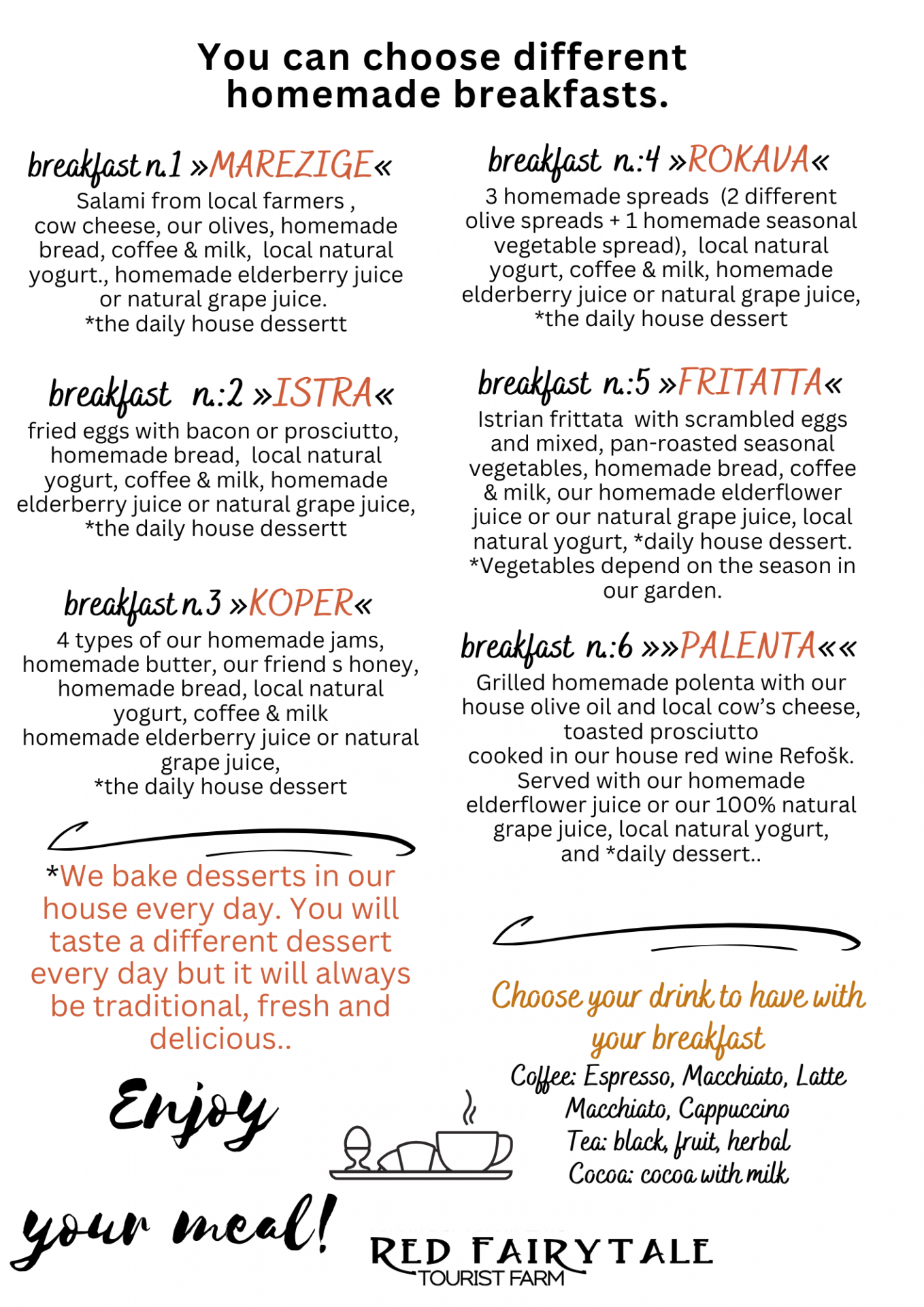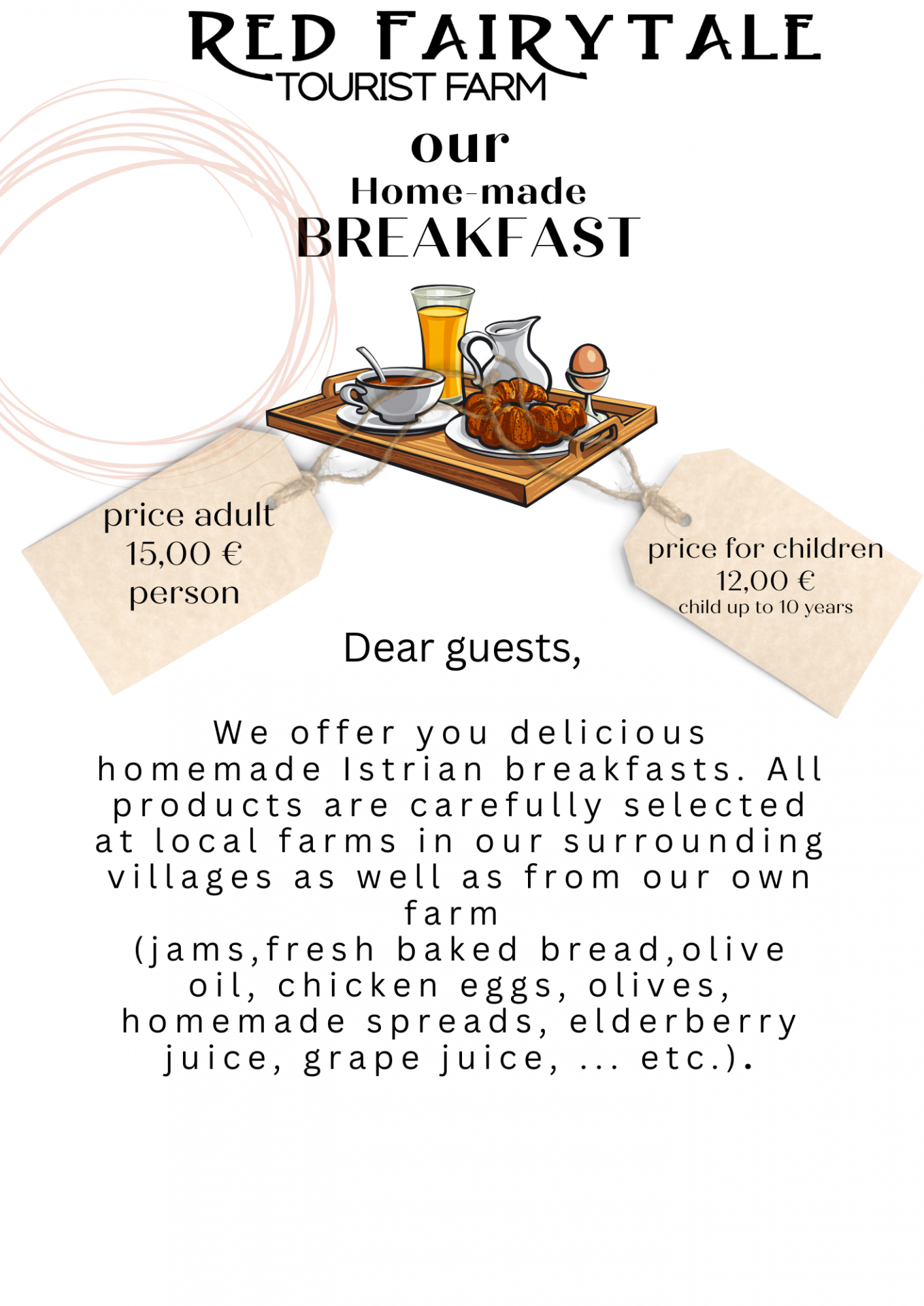 V naših nastanitvenih apartmajih vam nudimo tudi slastne domače zajtrke. Vsi izdelki so skrbno izbrani na kmetijah v naših okoliških vaseh. Nekaj je seveda tudi iz naše kmetije :)(razne marmelade, oljčno olje, vložene oljke, bezgov sok,100% naravni grozdni sok, hišne sladice, itd.).